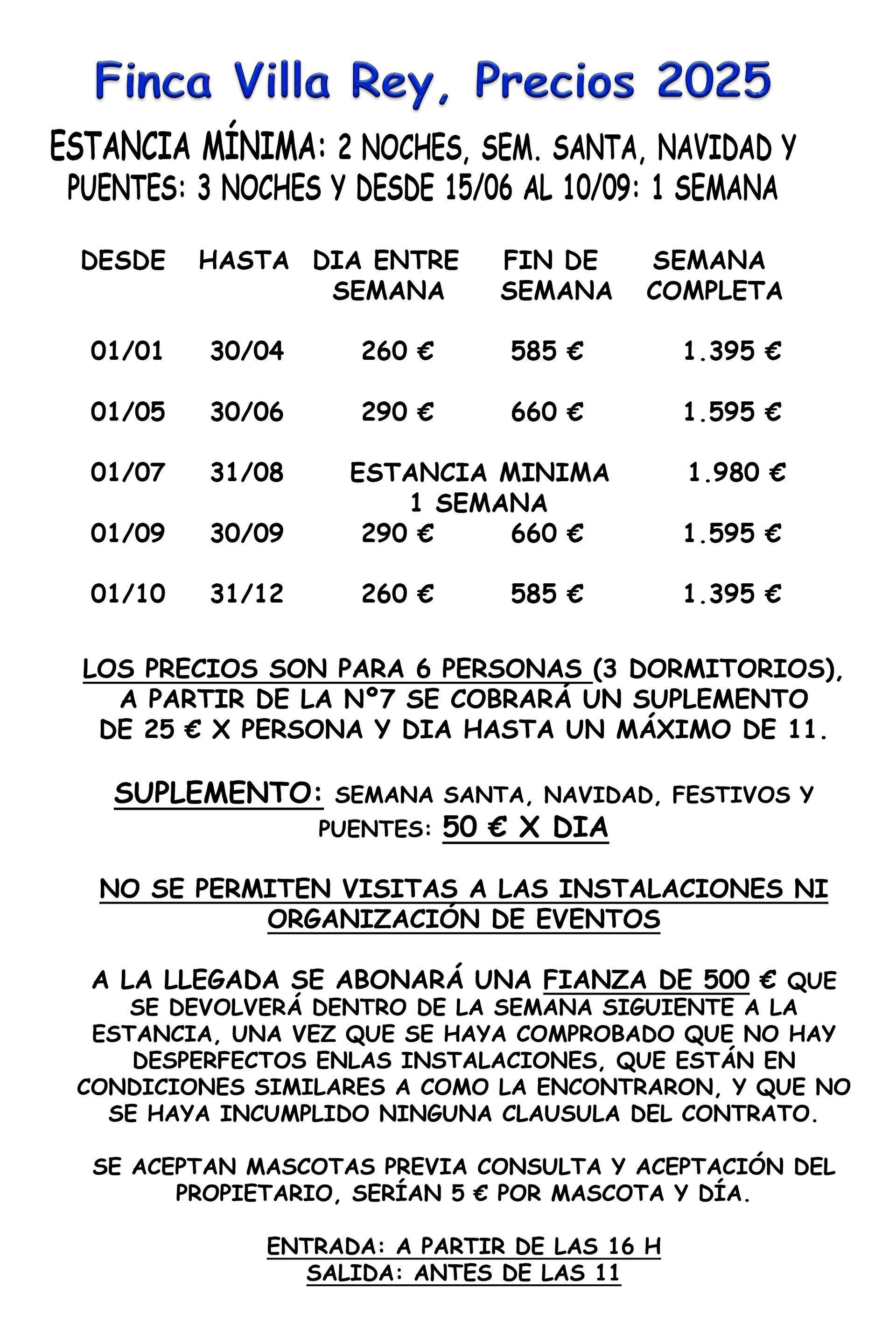 Los precios que aparecen en la tabla de tarifas son hasta 6 personas (3 dormitorios), aunque en la casa hay capacidad para 11 huéspedes. A partir de ese número de huéspedes (6), se cobrará un suplemento de 20 € x persona x noche. Suplemento de 30 €/día en fechas: Semana Santa, Navidad, Festivos y puentes. Se abonarán 500 € de fianza que se devolverán dentro de la semana siguiente a la estancia, una vez que se haya comprobado que no hay desperfectos en las instalaciones y que estas están en condiciones similares a como la encontraron, además de que no se haya incumplido ninguna cláusula del contrato.